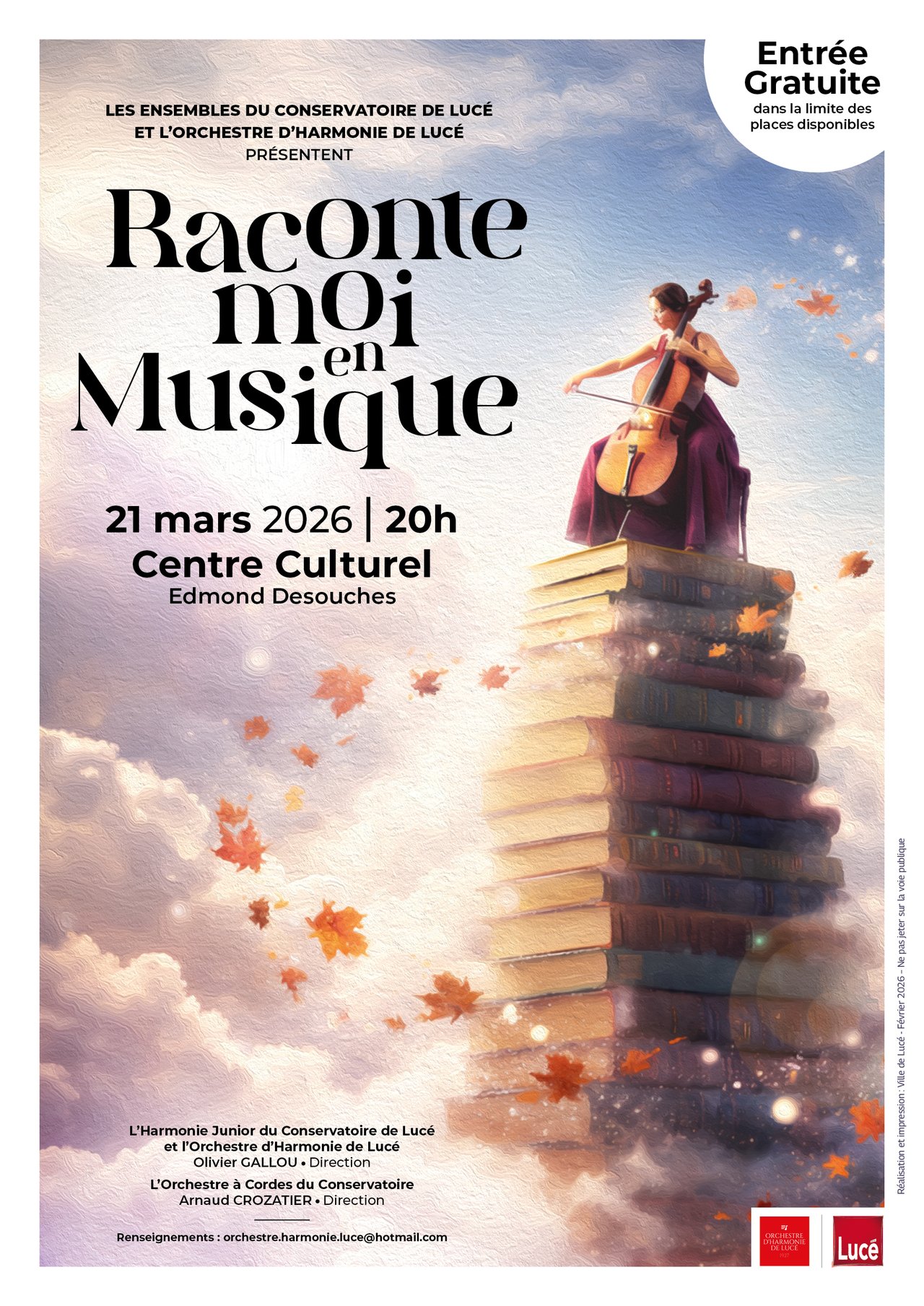 Les ensembles du Conservatoire et l’Orchestre d’Harmonie de Lucé vous proposent un concert intitulé « Raconte-moi en musique », une soirée qui mêle œuvres classiques, musiques de films et inspirations du monde.